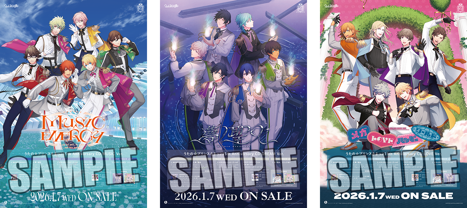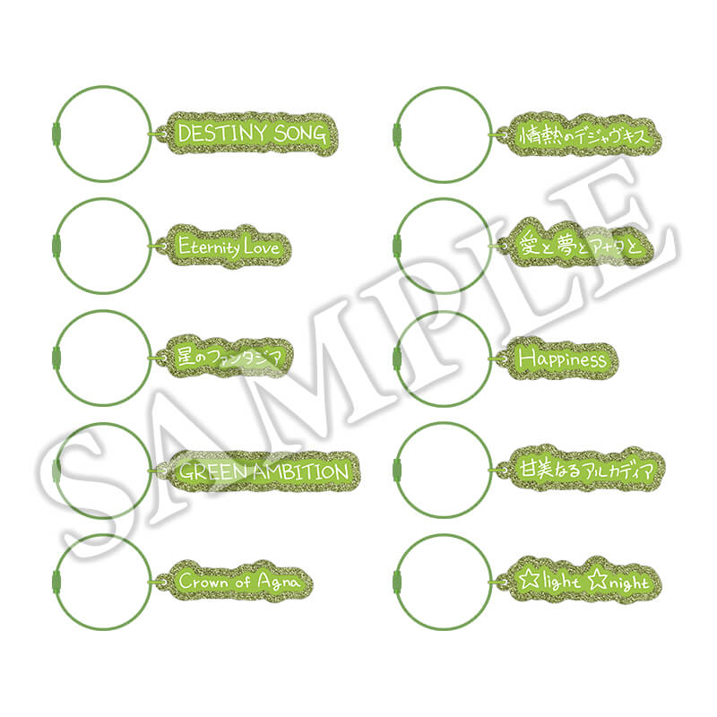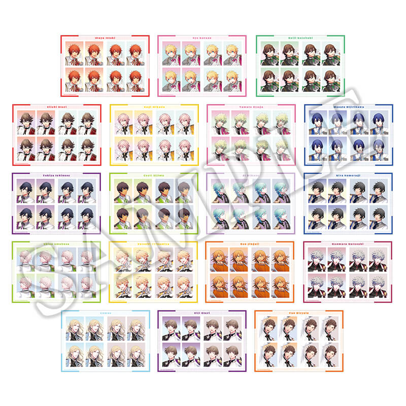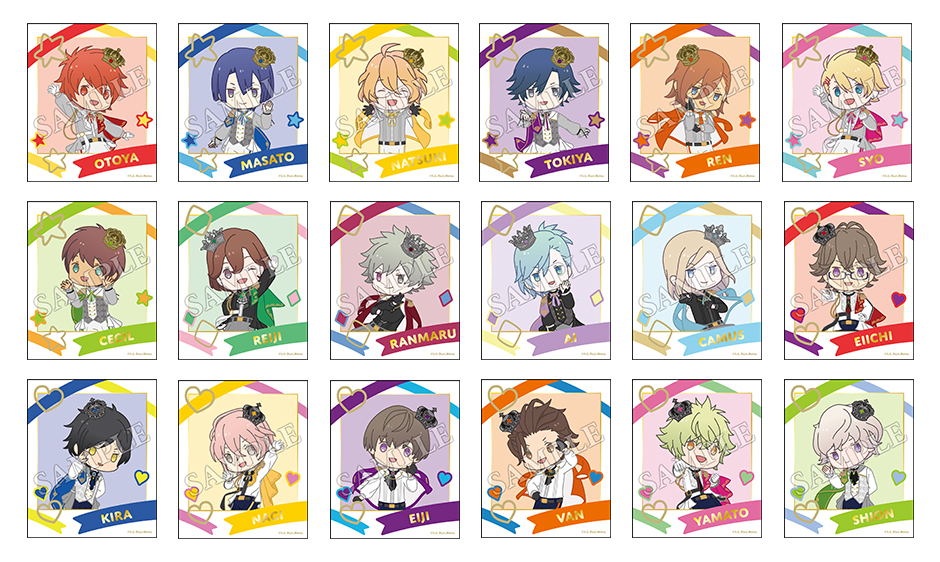「一十木音也」「聖川真斗」「四ノ宮那月」「一ノ瀬トキヤ」「神宮寺レン」「来栖 翔」「愛島セシル」「寿 嶺二」「黒崎蘭丸」「美風 藍」「カミュ」「鳳 瑛一」「皇 綺羅」「帝 ナギ」「鳳 瑛二」「桐生院ヴァン」「日向大和」「天草シオン」 - 仕様